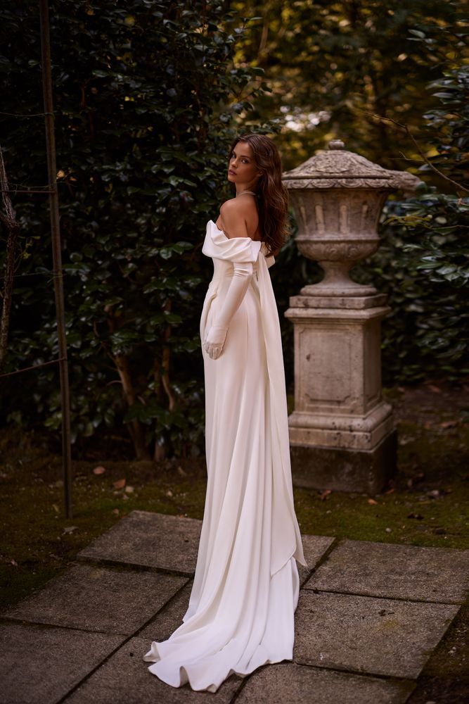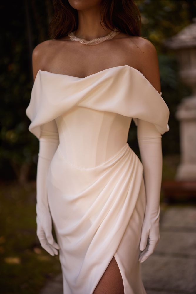 Elegant draped satin mermaid wedding gown with transformer sleeves. Featuring a structured bodice, zip closure on the back, and a flowing skirt with a delicate train and subtle slit. Its sleek, minimalist design is elevated by a draping accentuating curves and two voluminous, versatile sleeves that can be styled in multiple ways.