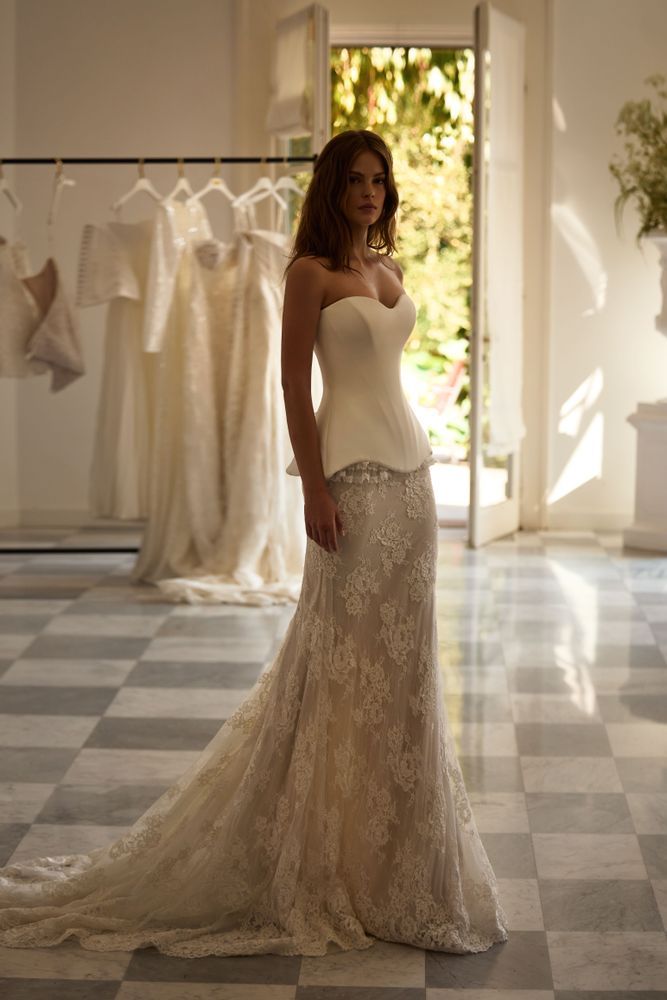 - Categories:Lorenzo Rossi, Milla Nova, Sleeping Beauty - Colour Options: Ivory / Nude-Ivory- Fabric: Satin, Chantilly Lace- Fit: Mermaid- Accessories: Joely Veil