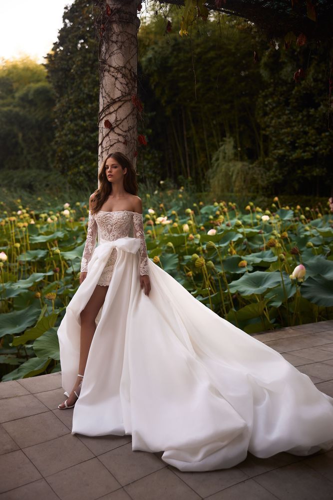 Splendid long-sleeved mini dress fashioned from chantilly lace and adorned with rich lace ornament throughout. Featuring off-the-shoulder lace sleeves, a semi-transparent bodice adorned with delicate lace patterns, a zip closure, and a fitted mini skirt with ivory lining. The bridal look can be elevated with a Rhona skirt.