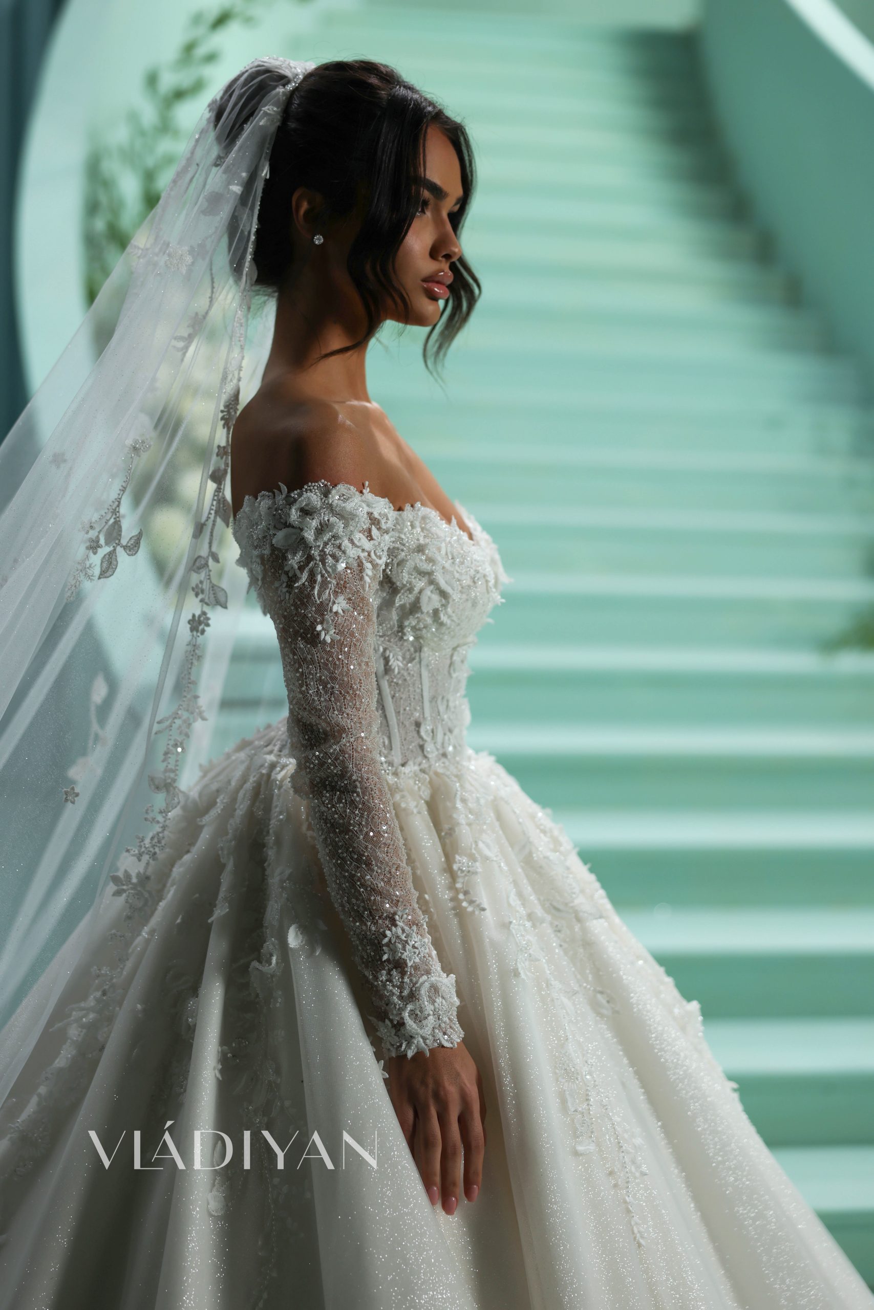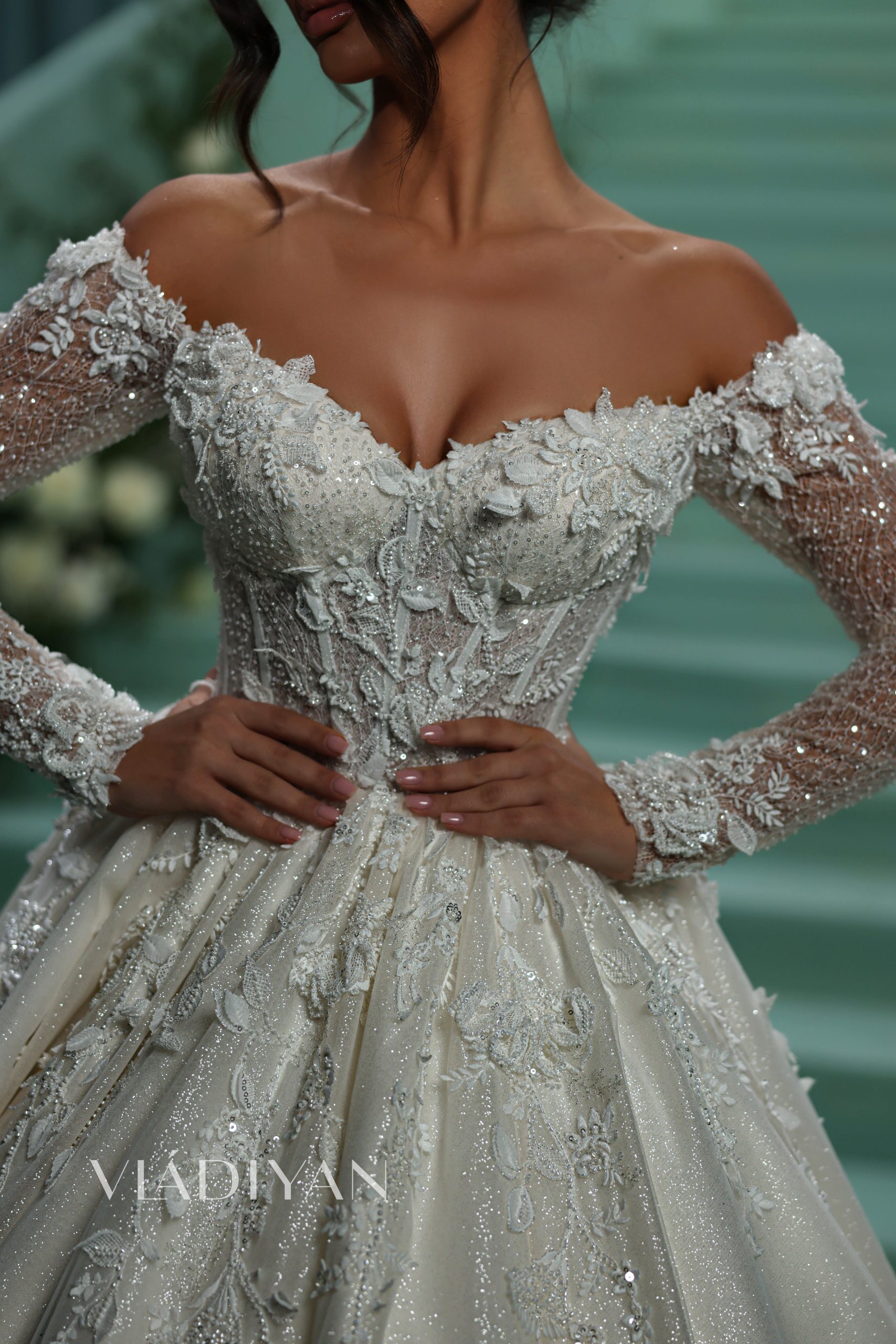 This magnificent corseted ballgown features an off-shoulder long sleeve neckline. The bodice and skirt are beautifully decorated with embroidered 3D flower appliqués, adding a touch of whimsy. The skirt dazzles with an abundance of glitter, creating a mesmerizing, sparkling effect.