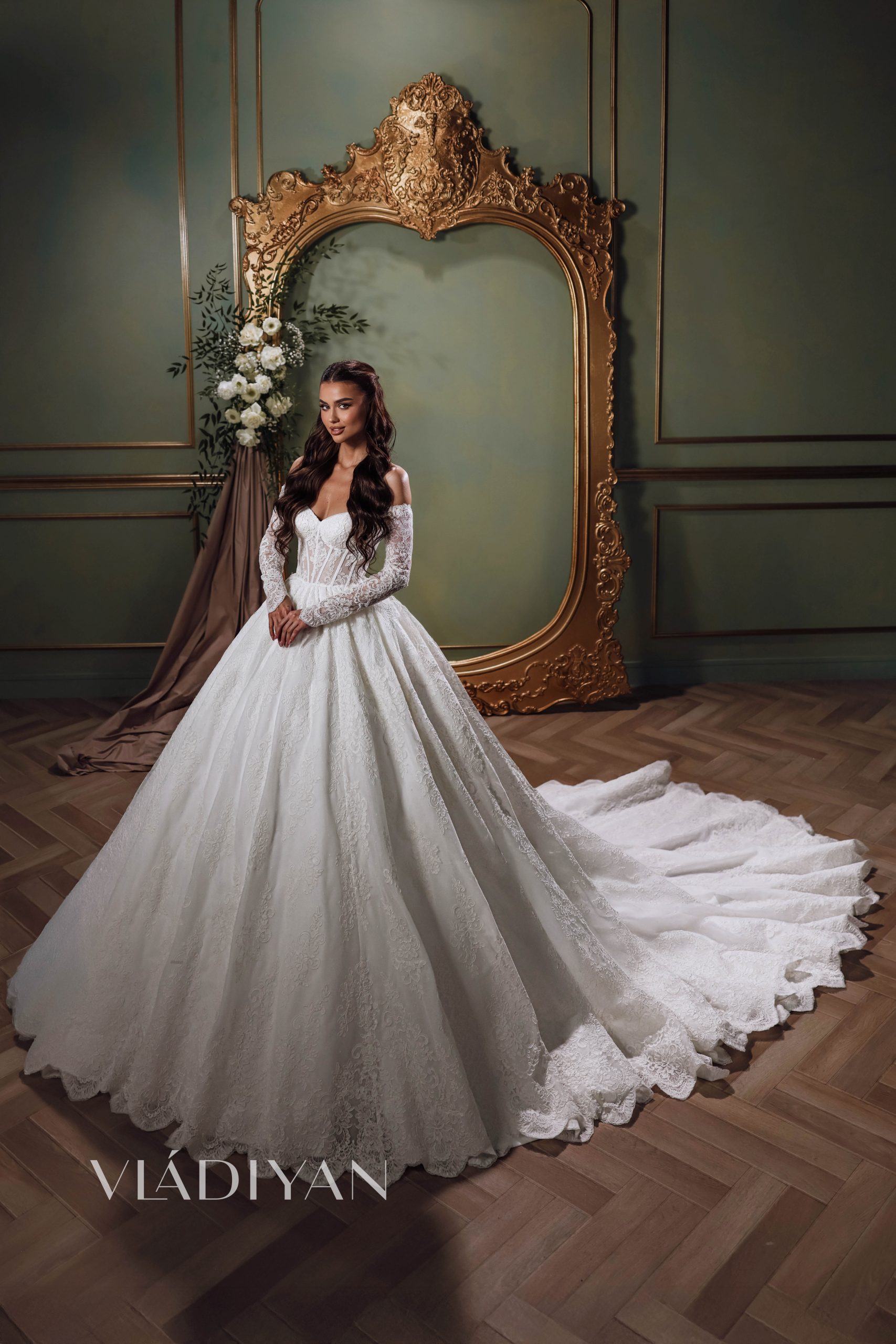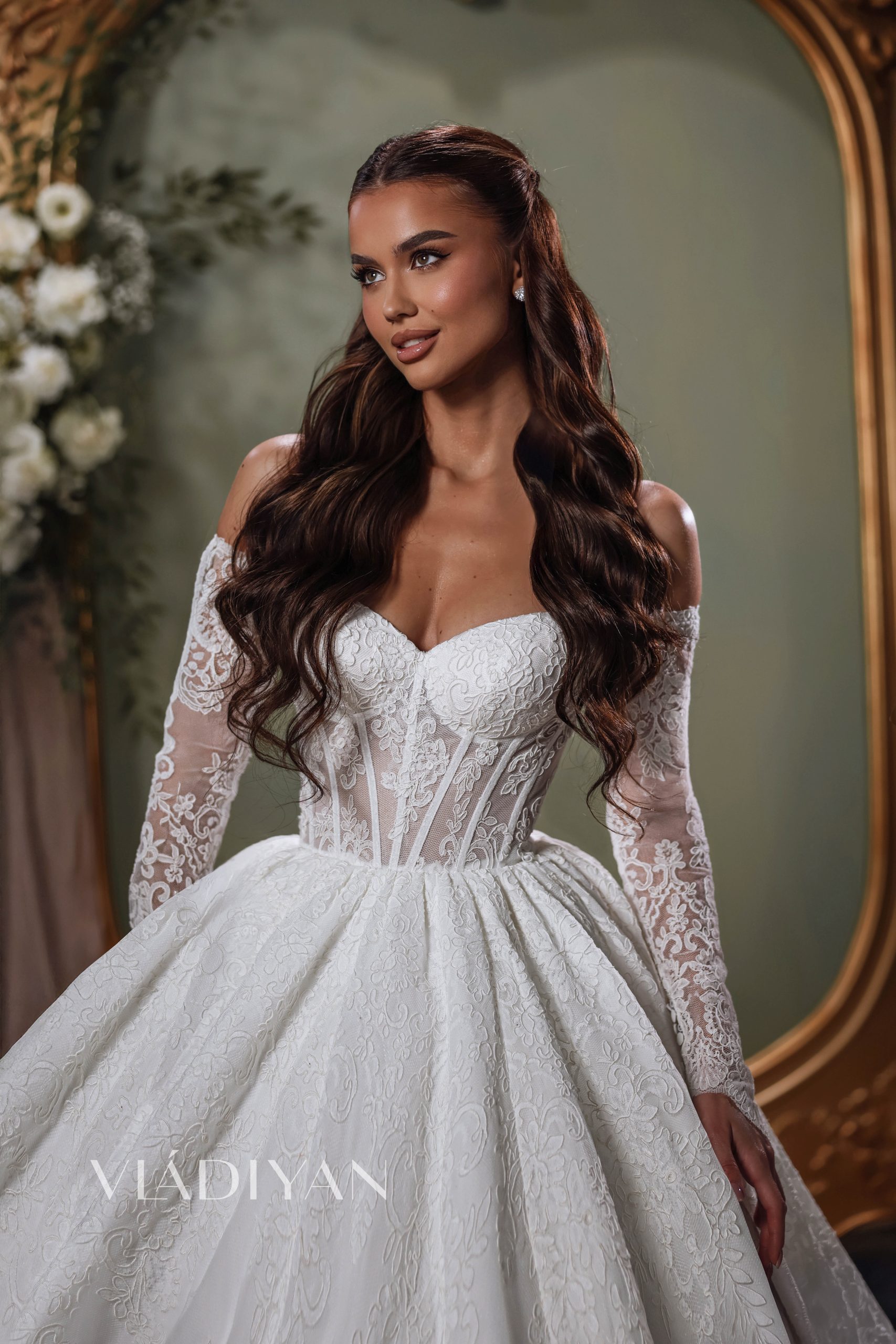This majestic corseted ballgown features off-shoulder long lace sleeves. The semi- transparent bodice creates a delicate balance between structure and softness, accentuating the waist while offering a modern, ethereal look. The entire gown is crafted from finest lace. The voluminous skirt flows into a long train.