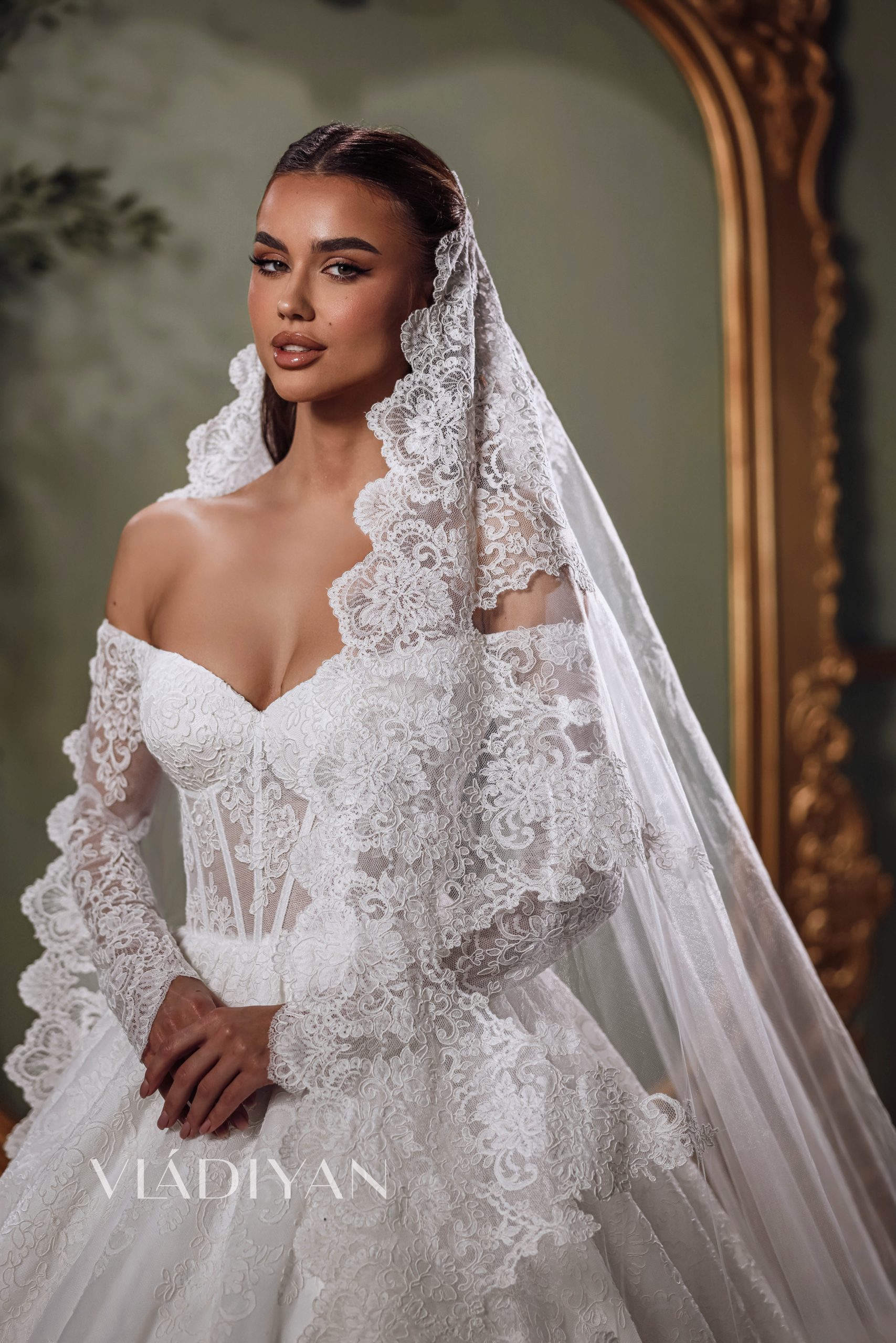 - Categories:First Spring, Vladiyan - Colour Options: Ivory- Fabric: Lace- Fit: Ball Gown- Accessories: Matching Veil