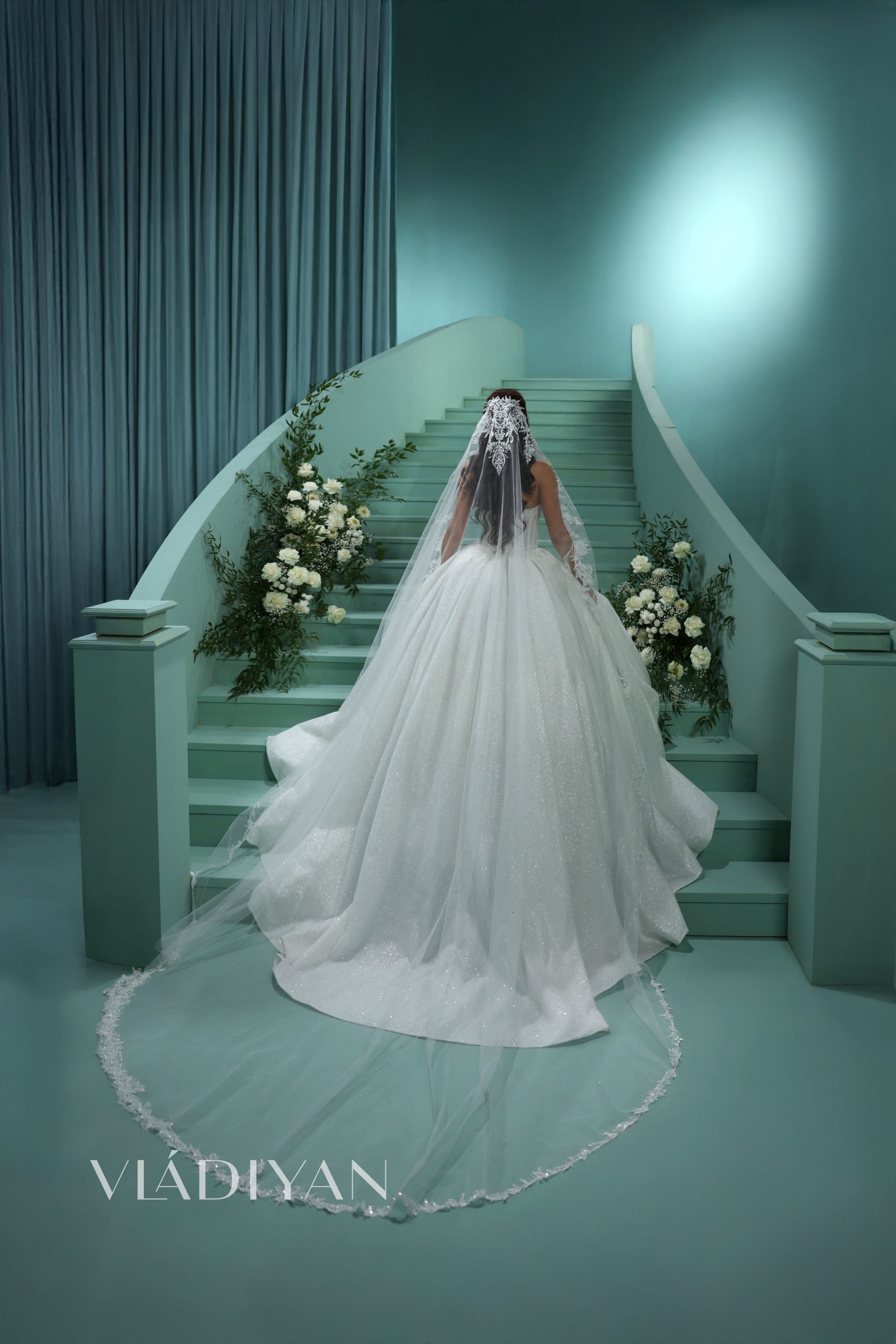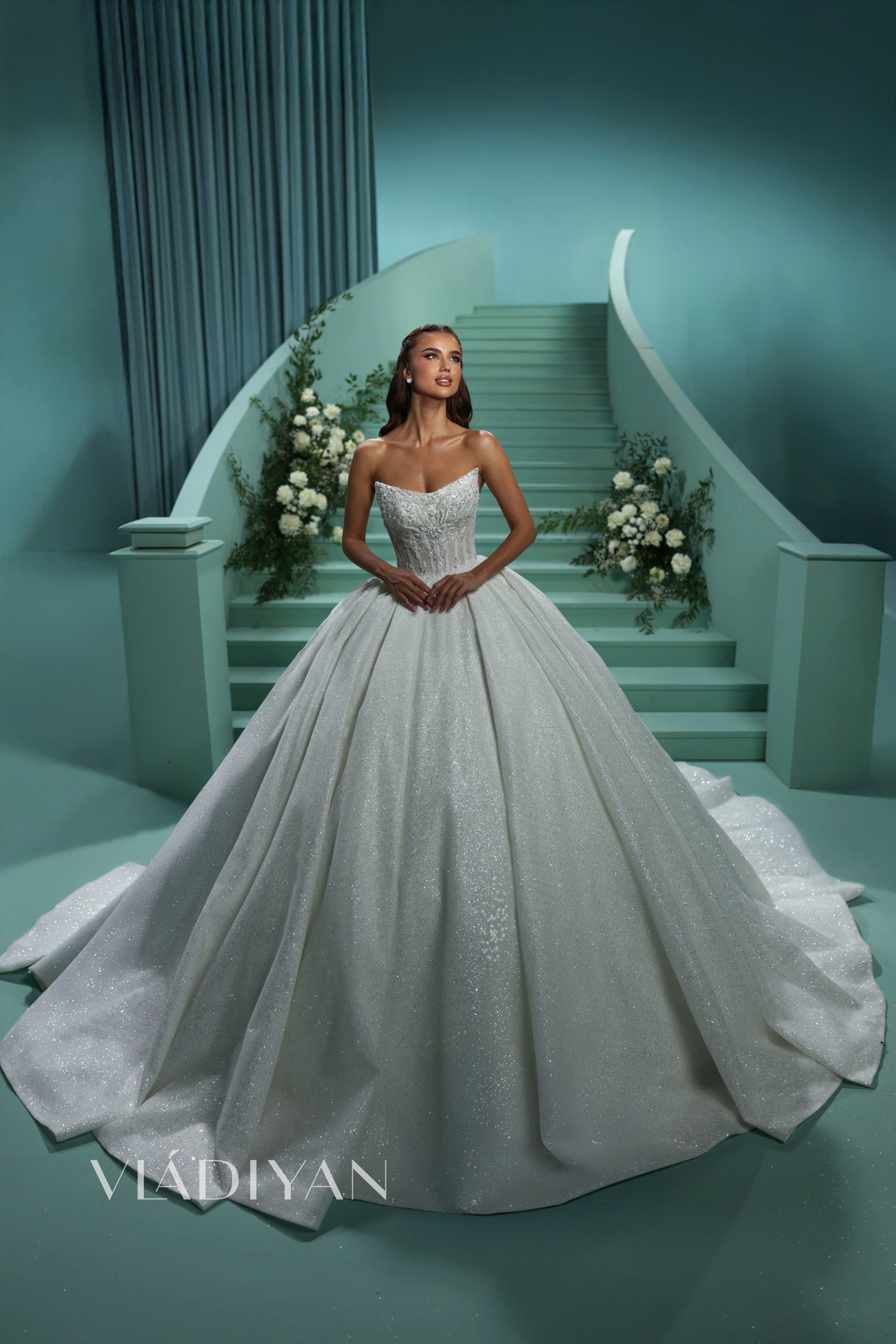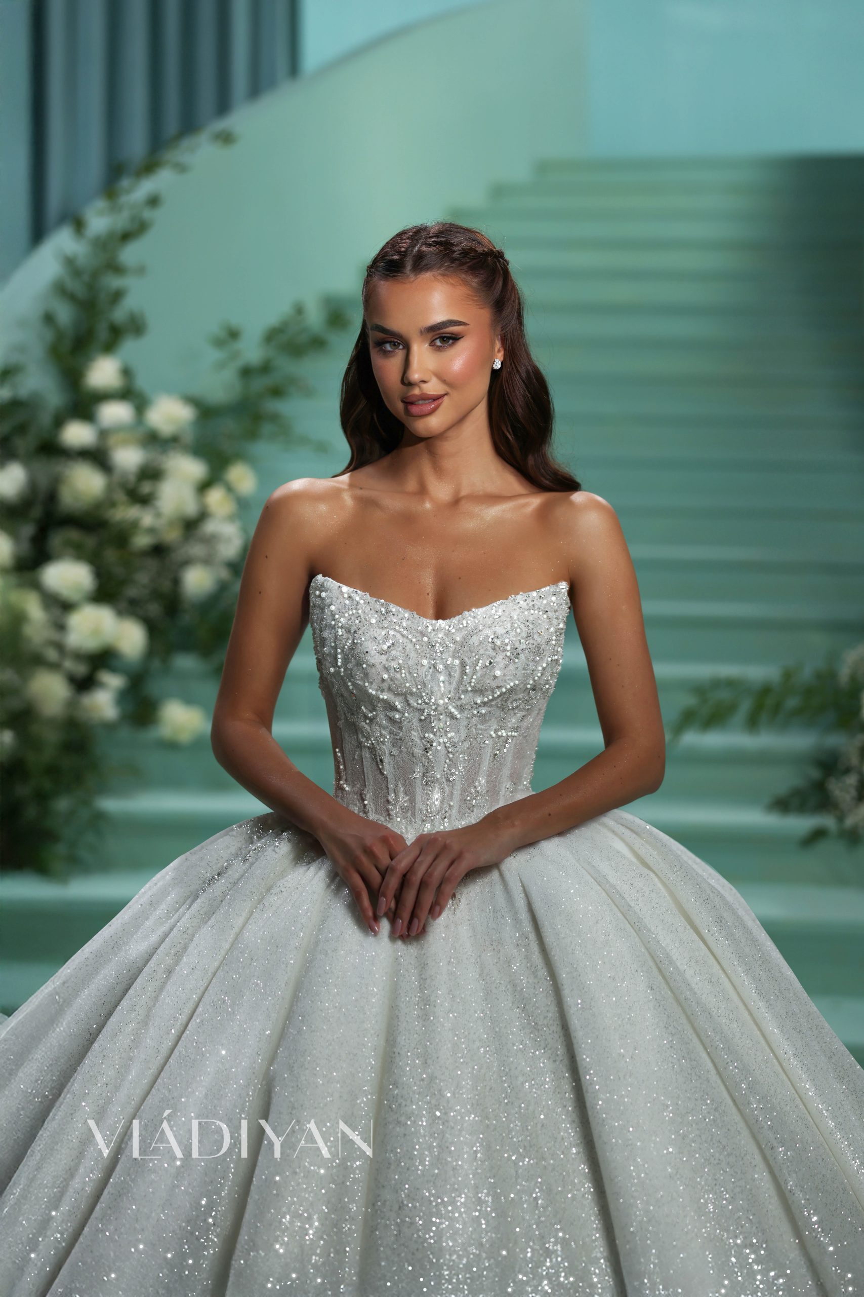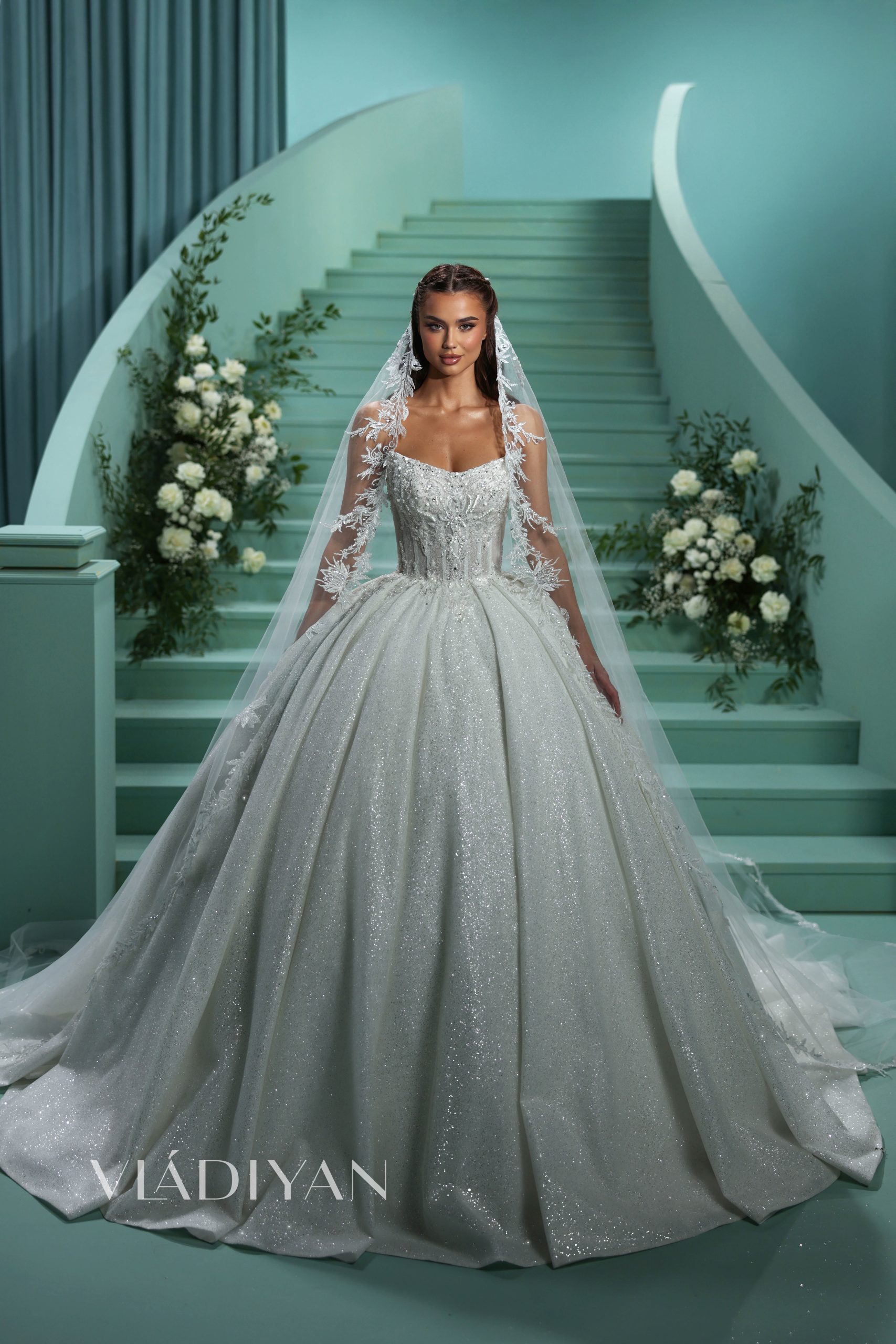 A radiant corseted ballgown features a sophisticated boat neckline. The bodice is beautifully adorned with intricate lace and embroidered with crystals. This delicate decor gently cascades onto the skirt, creating a seamless transition between the top and bottom. The skirt’s main feature is its voluminous folds, which add depth and dimension, while the extreme glitter tulle creates a breathtaking shimmering effect.