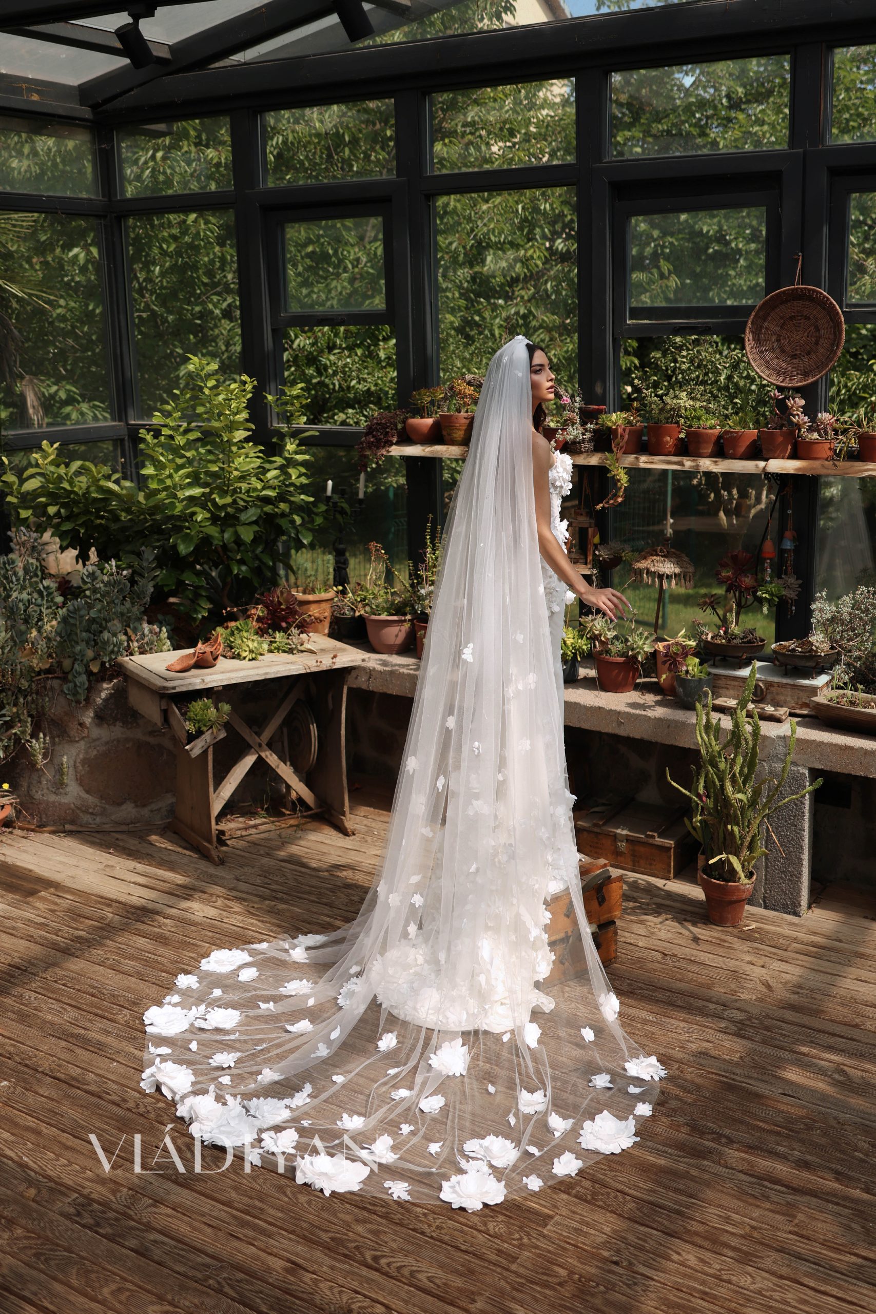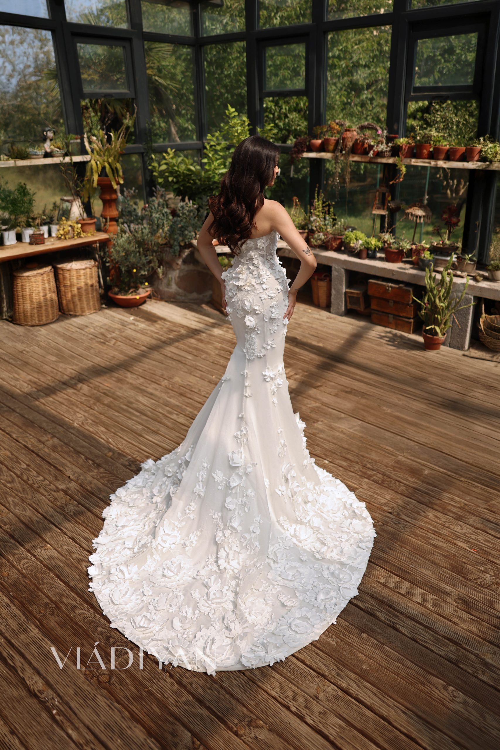 A sculpted mermaid silhouette, fully adorned with delicately hand-placed grand 3D flowers that bloom across every curve. The strapless corset bodice shapes and supports, while intricate detailing flows seamlessly into the fitted skirt, creating a look that feels both romantic and modern.